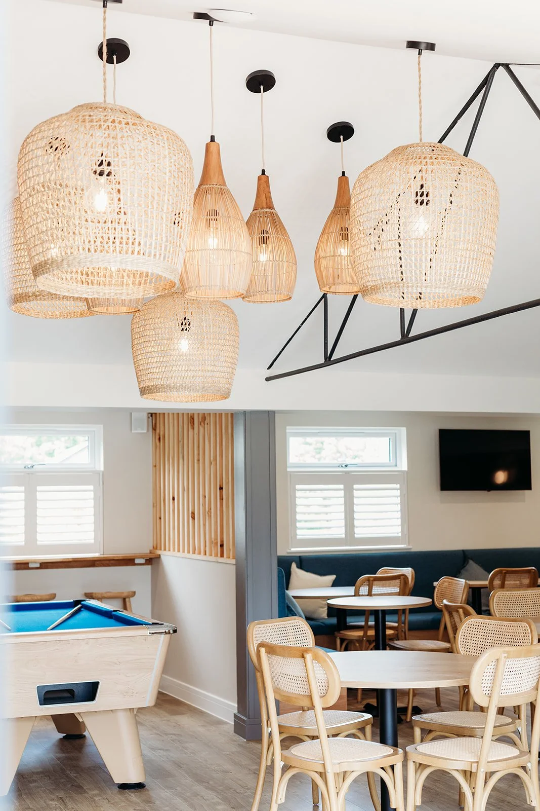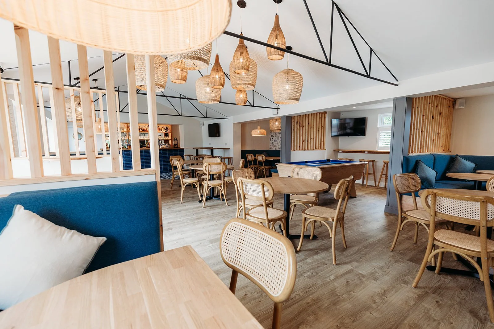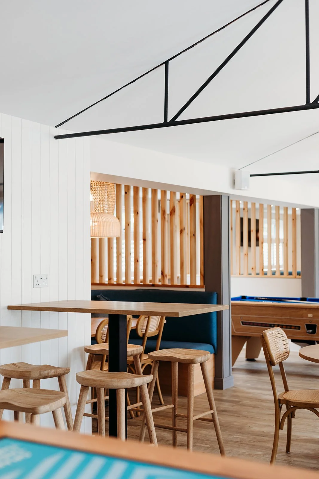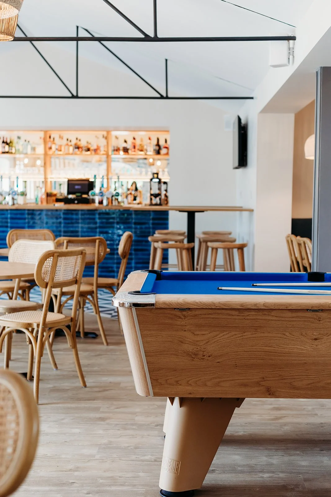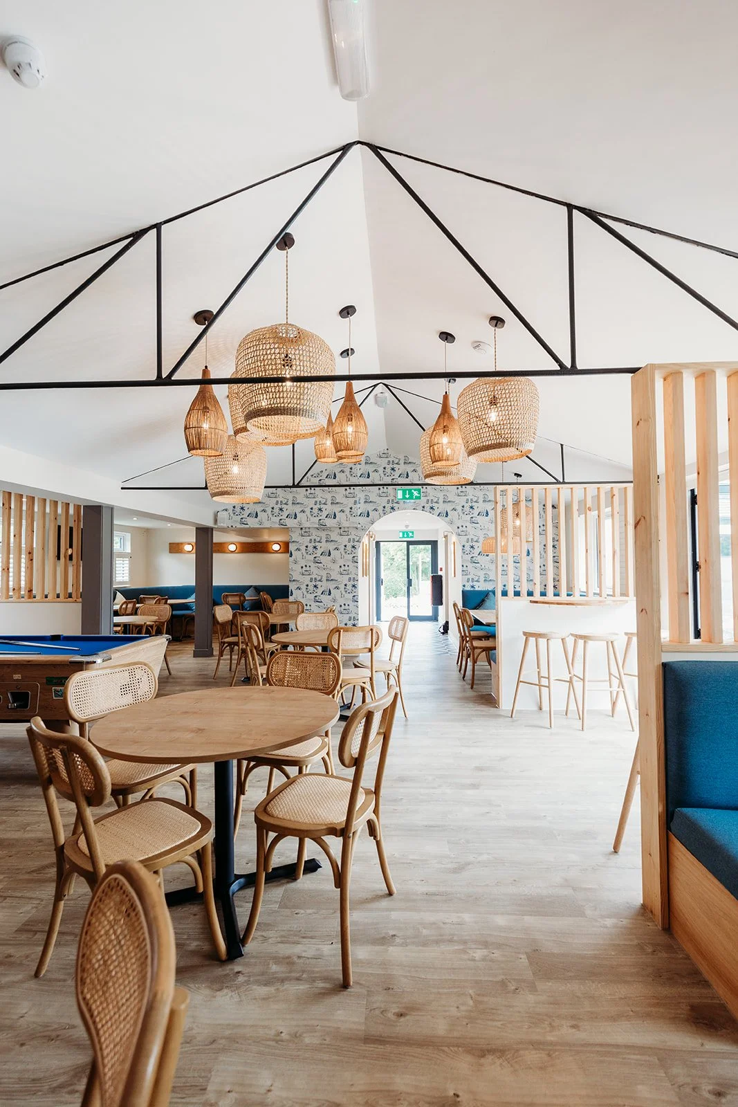 After over 20 years without a refresh, this beloved campsite bar was ready to surprise returning guests with a full transformation. The outdated tiled ceiling was removed to reveal the original vaulted structure, instantly opening up the space and giving it a sense of character and light.